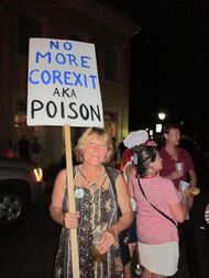Marine toxicologist Riki Ott blamed BP for poisoning locals with Corexit, which she alleges they used to hide their responsibility.[97] In August 2010 she wrote an open letter to the Environmental Protection Agency alleging that dispersants were still being used in secret and demanding that the agency take action.[98] The letter was published in the Huffington Post. Ott told Al Jazeera, "The dispersants used in BP's draconian experiment contain solvents, such as petroleum distillates and 2-butoxyethanol. Solvents dissolve oil, grease, and rubber. It should be no surprise that solvents are also notoriously toxic to people, something the medical community has long known."[99]