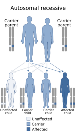 Usually, the mutation in the SMN1 gene is inherited from both parents in an autosomal recessive manner, although in around 2% of cases it occurs during early development (de novo).[1][10] The incidence of spinal muscular atrophy worldwide varies from about 1 in 4,000 births to around 1 in 16,000 births,[11] with 1 in 7,000 and 1 in 10,000 commonly quoted for Europe and the US respectively.[2]
