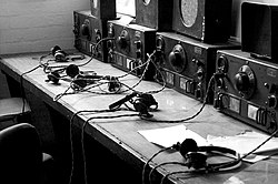 A radio listening station (also: listening post, radio intercept station or wireless intercept station, W/T station for wireless telegraphy) is a facility used for military reconnaissance, especially telecommunications reconnaissance (also known as signals intelligence SIGINT) by "intercepting" radio transmitter communications. In contrast to the original eavesdropping on an acoustic speech conversation, radio eavesdropping stations are used to eavesdrop on the information transmitted wirelessly using radio technology. For this purpose, highly sensitive radio receivers and suitable receiving antennas are used (see images).