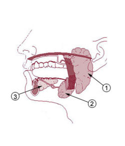 The most typical presentation of mumps is painful swelling of the salivary glands (classically the parotid gland) and fever (Enders 1996). The salivary glands in mammals are exocrine glands that produce saliva and include the parotid gland, the submandibular gland, and the sublingual gland. The parotid gland is the largest of the salivary glands. It is found in the subcutaneous tissue of the face, overlying the mandibular ramus and anterior and inferior to the external ear. It secretes saliva through Stensen's duct into the oral cavity, to facilitate mastication and swallowing.