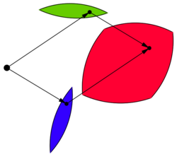 An alternative definition of the Minkowski difference is sometimes used for computing intersection of convex shapes.[3] This is not equivalent to the previous definition, and is not an inverse of the sum operation. Instead it replaces the vector addition of the Minkowski sum with a vector subtraction. If the two convex shapes intersect, the resulting set will contain the origin.