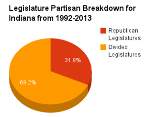 The chart below shows the partisan composition of the Office of the Governor of Indiana, the Indiana State Senate, and the Indiana House of Representatives from 1992 to 2013.