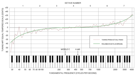 The Railsback curve, first measured by O.L. Railsback, expresses the difference between normal piano tuning and an equal-tempered scale (one in which the frequencies of successive notes are related by a constant ratio, equal to the twelfth root of two). For any given note on the piano, the deviation between the normal pitch of that note and its equal-tempered pitch is given in cents (hundredths of a semitone).