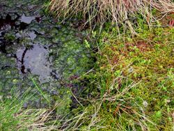 A limited number of bogs have the correct conditions for preservation of mammalian tissue. Most of these are located in colder climates near bodies of salt water.[8] For example, in the area of Denmark where the Haraldskær Woman was recovered, salt air from the North Sea blows across the Jutland wetlands and provides an ideal environment for the growth of peat.[9] As new peat replaces the old peat, the older material underneath rots and releases humic acid, also known as bog acid. The bog acids, with pH levels similar to vinegar, conserve the human bodies in the same way as fruit is preserved by pickling.[10] In addition, peat bogs form in areas lacking drainage and hence are characterized by almost completely anaerobic conditions. This environment, highly acidic and devoid of oxygen, denies the prevalent subsurface aerobic organisms any opportunity to initiate decomposition. Researchers discovered that conservation also required that they place the body in the bog during the winter or early spring when the water temperature is cold—i.e., less than 4 °C (40 °F).[10] This allows bog acids to saturate the tissues before decay can begin. Bacteria are unable to grow rapidly enough for decomposition at temperatures under 4 °C.[10]