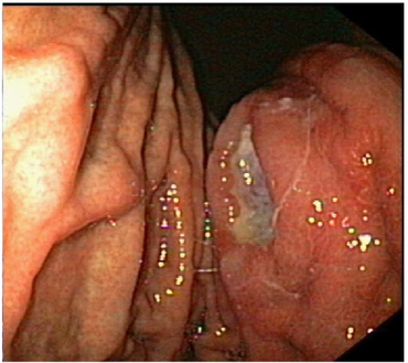 | Endoscopic image of gastric MALT lymphoma taken in body of stomach in patient who presented with upper GI hemorrhage. Appearance is similar to gastric ulcer with adherent blood clot. | |