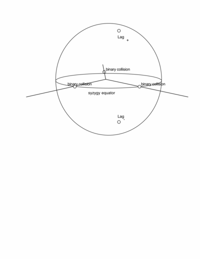 The north and south poles represent the two equilateral triangle configurations: one for each orientation (or vertex labelling). These points are labelled `Lag' in the figure because they also represent the orbits discovered by Lagrange in which the masses forever form an equilateral triangle. Points along the equator represent collinear triangles– triangles with zero area. Equally spaced along the equator are the three binary collision points, in which two of the three masses have collided. The great circle passing through such a collision point and the two Lagrange points represents the set of isosceles triangles whose symmetry axis passes through the non-colliding mass. These 3 great circles hit the equator orthogonally and with it divide the shape sphere into 12 congruent spherical triangles. This is the same \(12\) of \(|D_6| = 12\ .\) The group \(D_6\) is generated by reflections about these 4 great circles, and it acts freely and transitively on the 12 triangles: there is exactly one element of the group that takes one triangle to another.