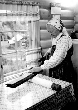 The Oxford English Dictionary dates the first use of the word in English from 1598, quoting John Florio who, in his 1598 dictionary, A World of Words, described "a kind of press to press buckram, fustian, or dyed linen cloth, to make it have a luster or gloss." The word comes from the Dutch mangel, from mangelen "to mangle", which in turn derives from the medieval Latin mango or manga which ultimately comes from the Greek manganon, meaning "axis" or "engine".[1] Some northern European countries used a table version for centuries, the device consisting of the rolling pin, a wood cylinder around which the damp cloth was wrapped, and the mangle board, a curved or flat length of wood which was used to roll and flatten the cloth. The oldest known model is a Norwegian mangle board, found near Bergen and dated 1444[2].
