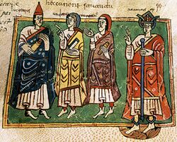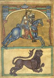 The elites were composed of counts, dukes, senatores, and other high noblemen, who were frequently related by marriage with the monarch,[51] and who usually claimed the most powerful positions in society, either as governors, bishops, or as palatine officials or companions of the king or queen. The Galician nobility, however, were also frequently found as rebels, either as supporters of a different candidate to the throne, or aspiring to it themselves, or simply as disobedient to the king's orders and will.[52] At the service of the noblemen were miles (knights) and infanzones; they were often found marching to war with their subalterns on behalf of a patron, or as vicars and administrators.