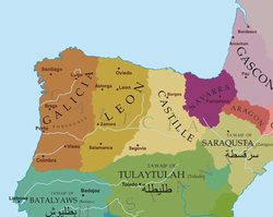 The 9th century saw this state expand southward, with Castilian and Asturian noblemen acquiring most of the northern Meseta,[39] while in Galicia, a similar impulse led to the conquest and re-population of the regions of Astorga, southern Galicia, and northern Portugal down to Coimbra, by noblemen mostly proceeding from northern Galicia.[40] Also significant was the pretended discovery of the tomb of Saint James the Great at what would become Santiago de Compostela;[41] the shrine constructed there became the religious center of the nation, as well as being the destination of a major international pilgrimage route, the Way of St. James. This increased the political and military relevance of Galicia, and its noble families aspired to positions of power within the kingdom through either military force[42] or by matrimonial alliance with the royal family.[43] To the east, this southern expansion led the capital of the Christian kingdom to be moved to the city of León, from which time the state is usually called the Kingdom of León. This same kingdom was frequently known as either Gallaecia or Galicia (Yillīqiya and Galīsiya) in Al-Andalus Muslim sources up to the 14th century,[44] as well as by many European Christian contemporaries.[45]