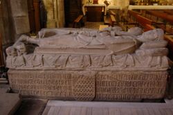 The ceremony in Compostela was more symbolic than effective, and Diego Gelmírez, Pedro Fróilaz, and other Galician nobles headed first to Lugo, and later to the royal seat in León to enthrone Alfonso VII there. However, they were intercepted at Viadangos, near León, by the troops of Alfonso the Battler. The Galician knights charged, but they were outnumbered and surrounded by the Aragonese infantry, who defeated the Galicians and frustrated their plans. Pedro Fróilaz was taken prisoner, whilst other nobles were killed, but bishop Gelmírez managed to escape, delivering his protégé, the young king, to his mother,[87] who began acting against her new husband. From then until Alfonso VII came of age and Urraca died, the entire realm lived under a constant state of civil war, experiencing frequent seizures and shifting alliances between mother and child, and between Urraca and her Aragonese husband.[88] This same civil war was evident in the kingdom of Galicia, where partisans of Diego Gelmirez, of Pedro Fróilaz, and of other nobles and warlords, found themselves battling each other as defenders of either Queen Urraca or King Alfonso VII, or under their own agenda,[89] whilst Alfonso of Aragón and Theresa of Portugal also had their own supporters. With Calixtus II, uncle of Alfonso VII, becoming Pope, Diego Gelmírez secured the elevation of Compostela into an archdiocese in 1120 through a steady flow of generous donations sent to Rome.[90] Bishop Diego attempted to gain recognition for Compostela by becoming primate of Spain, but lost the title to Toledo, the old Visigoth capital. Later, however, he sought to have Compostela recognized as the metropolitan church of the Kingdom of Galicia, in opposition to the church of Braga, which had been the metropolitan since at least the days of Martin of Dumio. Calixtus II did not grant Gelmirez's claims, but finally decided to enlarge Compostela's jurisdiction in an anomalous fashion: instead of Galicia, Compostela was granted control over the old jurisdiction of Mérida, the former metropolitan church of Lusitania, which was then under Muslim control without a bishop.[91] Consequently, the bishops of Coimbra, Lamego, Viseu, or Salamanca, among others, were subjected to the rule of Compostela. Braga, metropolitan of the cities of Galicia other than Compostela, found itself limited by the jurisdiction of the latter, and became the centre of the movement for the independence of Portugal. In 1128 the leader of the Galician nobility, Fernando Peres de Trava, together with his lover Countess Theresa of Portugal, who were acting with absolute liberty in most of Galicia and Portugal,[92] were defeated by Afonso Henriques, Theresa's son. This was the foundation of the future kingdom of Portugal. On his death in 1156, Alfonso VII divided his domains under pressure from the Castilian and Galician nobles,[93] bequeathing León and Galicia to his second son, Ferdinand II. Ferdinand, who had been using the title of King of Galicia at least since 1152,[94] had been as a child ward of the influential Count Fernando Peres de Trava, heir and son of Count Pedro Fróilaz, who in turn had been tutor of Alfonso VII.[95] In 1158 the death of his brother Sancho III of Castile permitted him to intervene the Castilian internal affairs,[96] which led him to use the title Rex Hispaniarum.[97] In his own realm, he continued his father's policies[98] by granting Cartas Póvoa or Foros (constitutional charters) to towns such as Padrón, Ribadavia, Noia, Pontevedra and Ribadeo,[99] most of them possessing important harbors or sited in rich valleys. Thus he promoted the growth of the bourgeoisie and improved the local economy through the expansion of commerce. He also contributed to the economic and artistic development of the Cathedral of Santiago de Compostela, at least after the death of bishop Martin in 1168, and under the rule of two of his closest subjects, bishops Pedro Gudesteiz and Pedro Suárez de Deza.[100] Ferdinand died in 1188, in Benavente, leaving two main claimants to the throne: his sons Sancho, born of a Castilian noblewoman, and Alfonso, from Ferdinand's first marriage, to Urraca of Portugal. Alfonso, supported by the Galician nobility and by the archbishop of Compostela Pedro Suárez de Deza,[101] hastened to Santiago de Compostela carrying the remains of his father and proclaiming himself King there.[102] Unlike his father, he dropped the title of "King of the Spains", preferring the use of "King of León" and "King of León and Galicia".[103] Alfonso IX's long reign was characterized by his rivalry with Castile and Portugal,[104] and by the promotion of the royal power at the expense of the church and nobility, whilst maintaining his father's urban development policies.[105] He was one of the first European monarchs to call for a general council, summoning not only the nobility and the Church, but also the inhabitants of the towns and cities, presaging modern representative parliaments.[106] The last years of his reign were also marked by the conquest of large areas of what is now Extremadura (including the cities of Cáceres, Mérida and Badajoz) then in the hands of the Almohad Caliphate, a territory also wanted by the Portuguese.[107]