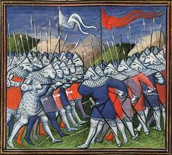 John's first attempt to make good on this claim failed when his troops were diverted to Poitou to participate in the clashes against France as part of the Hundred Years' War. On July 25, 1386, with the support of a papal bull of Urban IV confirming his right to the Crown of Castile, he landed in Coruña with some 1500 archers, 1500 lancers and some 4000 other supporters, without fighting or attacking the city.[173] Following negotiations it was agreed that the city would open its gates once the Duke was received in Santiago de Compostela; being admitted there, John's troops, assisted by Galician exiles, took control of Pontevedra, Vigo, Baiona and Betanzos without a fight, whilst John himself proceeded to Ourense, defended by Breton troops in the service of John I of Castile. Meanwhile, the port of Ferrol was taken by John's ally the Portuguese king John I of Portugal, and the town of Ribadavia—where the local Jews, most of them of Leonese extraction, apparently presented a fierce defence[174]—was assaulted after a siege by troops commanded by Thomas Percy.[175] With the capture of Ferrol, the Duke controlled the whole Kingdom of Galicia, as reported in the chronicles of Jean Froissart: «avoient mis en leur obeissance tout le roiaulme de Gallice».[176]