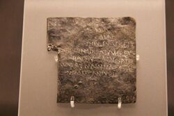 In 1979–80, the Bath curse tablets were found at the site of Aquae Sulis (now Bath in England).[36] All but one of the 130 tablets concerned the restitution of stolen goods.[37] Over 80 similar tablets have been discovered in and about the remains of a temple to Mercury nearby, at West Hill, Uley,[38] making south-western Britain one of the major centres for finds of Latin defixiones.