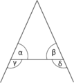The sum of the angles of a triangle is equal to a straight angle (180 degrees).[14] This causes an equilateral triangle to have three interior angles of 60 degrees. Also, it causes every triangle to have at least two acute angles and up to one obtuse or right angle.