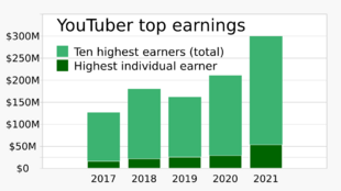 During the 2010s, the ability for YouTubers to achieve wealth and fame due to success on the platform increased dramatically. In December 2010, Business Insider estimated that the highest earner on YouTube during the previous year was Dane Boedigheimer, creator of the web series Annoying Orange, with an income of around $257,000.[33] Five years later, Forbes released its first list of the highest-earning YouTube personalities, estimating top earner PewDiePie's income during the previous fiscal year at $12 million, more than some popular actors such as Cameron Diaz or Gwyneth Paltrow.[34]Forbes estimated that the tenth-highest earner that year was Rosanna Pansino at $2.5 million.[lower-alpha 1] That year, NME stated that "vlogging has become big business."[36] The rapid influx of wealth within the YouTube community has led some to criticize YouTubers for focusing on earnings more than the creativity and connection with their fanbase that some claim was at the heart of the platform before expanded monetization.[37][38][39] In August 2021, it was reported Kevin Paffrath made $5 million in just the first 3 months of 2021 and his YouTube analytics showed he made "several million" in ad revenue within the prior 12 months.[40] By 2021, YouTuber earnings had expanded even more, with Forbes estimating that the highest earner that year was MrBeast at $51 million.[41]
