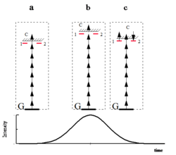 where [math]\displaystyle{ W }[/math] is the time-dependent energy difference between the two dressed states. In interaction with a short pulse, if the dynamic resonance is reached in the rising or the falling part of the pulse, the population practically remains in the ground state and the effect of multiphoton resonances may be neglected. However, if the states go onto resonance at the peak of the pulse, where [math]\displaystyle{ \mathrm{d}W/\mathrm{d}t = 0 }[/math], then the excited state is populated. After being populated, since the ionization potential of the excited state is small, it is expected that the electron will be instantly ionized.