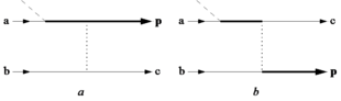 The re-scattering model in Kuchiev's version (Kuchiev's model) is quantum mechanical. The basic idea of the model is illustrated by Feynman diagrams in figure a. First both electrons are in the ground state of an atom. The lines marked a and b describe the corresponding atomic states. Then the electron a is ionized. The beginning of the ionization process is shown by the intersection with a sloped dashed line. where the MPI occurs. The propagation of the ionized electron in the laser field, during which it absorbs other photons (ATI), is shown by the full thick line. The collision of this electron with the parent atomic ion is shown by a vertical dotted line representing the Coulomb interaction between the electrons. The state marked with c describes the ion excitation to a discrete or continuum state. Figure b describes the exchange process. Kuchiev's model, contrary to Corkum's model, does not predict any threshold intensity for the occurrence of NS ionization.