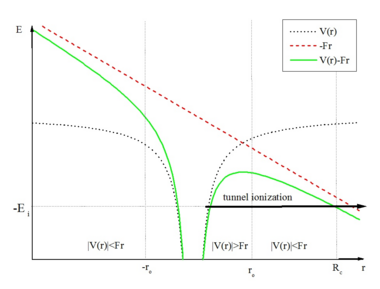 Keldysh[6] modeled the MPI process as a transition of the electron from the ground state of the atom to the Volkov states.[7] In this model the perturbation of the ground state by the laser field is neglected and the details of atomic structure in determining the ionization probability are not taken into account. The major difficulty with Keldysh's model was its neglect of the effects of Coulomb interaction on the final state of the electron. As it is observed from figure, the Coulomb field is not very small in magnitude compared to the potential of the laser at larger distances from the nucleus. This is in contrast to the approximation made by neglecting the potential of the laser at regions near the nucleus. Perelomov et al.[8][9] included the Coulomb interaction at larger internuclear distances. Their model (which we call PPT model) was derived for short range potential and includes the effect of the long range Coulomb interaction through the first order correction in the quasi-classical action. Larochelle et al.[10] have compared the theoretically predicted ion versus intensity curves of rare gas atoms interacting with a Ti:Sapphire laser with experimental measurement. They have shown that the total ionization rate predicted by the PPT model fit very well the experimental ion yields for all rare gases in the intermediate regime of Keldysh parameter.