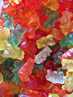 The starch mogul system is a method of molding candy that allows for the use of materials that are more runny compared to normal processes. It is used in the manufacture of jelly beans[2] and gummy bears,[3][4] and was formerly used in the manufacture of marshmallows before the advent of the extrusion process.[5][6] The starch mogul system uses a machine with trays of starch.[7] Each tray has a mold firmly pushed down in it to create cavities in the starch. The cavities are then filled with the candy material, and allowed to cool or harden as necessary. During this time, the starch helps absorb excess water, making the candy moldings handleable.[2] Finally, the trays are dumped and the candy is separated from the starch, which is then dried and reused by the machine.[2] Hans Arthur Faerber, founder of NID Pty Ltd, created the current form of the starch mogul system[8] in 1952.