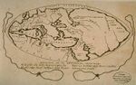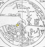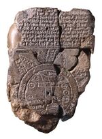A Babylonian world map, known as the Imago Mundi, is commonly dated to the 6th century BCE.[1] The map as reconstructed by Eckhard Unger shows Babylon on the Euphrates, surrounded by a circular landmass showing Assyria, Urartu (Armenia)[2] and several cities, in turn surrounded by a "bitter river" (Oceanus), with eight outlying regions (nagu) arranged around it in the shape of triangles, so as to form a star. The accompanying text mentions a distance of seven beru between the outlying regions. The descriptions of five of them have survived:[3]