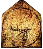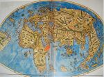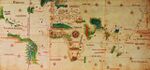 The Genoese map of 1457 is a world map that relied extensively on the account of the traveler to Asia Niccolo da Conti, rather than the usual source of Marco Polo.[29] The author is unknown, but is a more modern development than the Fra Mauro world map, less intricate and complete, with fairly good proportions given to each of the continents. The map depicts the main landmarks of the time: Prester John in Africa, the Great Khan in China, "Xilam" (Ceylom) and Sumatra, and the design of a three-masted European ship in the Indian Ocean, something which had not occurred, suggesting that a sealane was a possibility.[29]