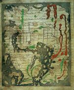 The Kangnido (the full Hanja name means "Map of Integrated Lands and Regions of Historical Countries and Capitals")[26] is a map of the world made in Korea in 1402. Created under the supervision of Korean officials as part of a cultural project of the newly founded Joseon Dynasty,[27] it is the most familiar example of the known-world maps based on Chinese cartographic techniques with additional input from western sources, via Islamic scholarship in the Mongol Empire. Superficially similar to the Da Ming Hun Yi Tu (which has been less well known in the West because it is kept in closed archive storage) the Kangnido shows its Korean origin in the enlargement of that country, and incorporates vastly improved (though wrongly positioned, scaled and oriented) mapping of Japan. Elsewhere, the map betrays a decorative rather than practical purpose, particularly in the portrayal of river systems, which form unnatural loops rarely seen on Chinese maps. Nonetheless, it is considered as "superior to anything produced in Europe prior to the end of the fifteenth century".[28]