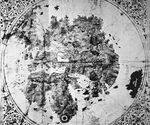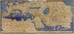 The De Virga world map was made by Albertinus de Virga between 1411 and 1415. Albertin de Virga, a Venetian, is also known for a 1409 map of the Mediterranean, also made in Venice. The world map is circular, drawn on a piece of parchment 69.6 cm × 44 cm (27.4 in × 17.3 in). It consists of the map itself, about 44 cm (17 in) in diameter, and an extension containing a calendar and two tables.