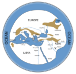 Anaximander (died c. 546 BCE) is credited with having created one of the first maps of the world,[4] which was circular in form and showed the known lands of the world grouped around the Aegean Sea at the center. This was all surrounded by the ocean.