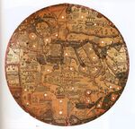 The Ebstorf Map was an example of a European mappa mundi, made by Gervase of Ebstorf, who was possibly the same man as Gervase of Tilbury,[20] some time in the thirteenth century. It was a very large map: painted on 30 goatskins sewn together, it measured about 3.6 m × 3.6 m (12 ft × 12 ft). The head of Christ was depicted at the top of the map, with his hands on either side and his feet at the bottom.[21] The Map was a greatly elaborated version of the medieval tripartite or T and O map; it was centred on Jerusalem with east on top of the map. It represented Rome in the shape of a lion, and had an evident interest in the distribution of bishoprics.[22] The original was destroyed during World War II, but some photographs and colour copies remain.