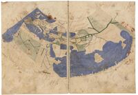 Surviving texts of Ptolemy's Geography, first composed c. 150, note that he continued the use of Marinus's equirectangular projection for its regional maps while finding it inappropriate for maps of the entire known world. Instead, in Book VII of his work, he outlines three separate projections of increasing difficulty and fidelity. Ptolemy followed Marinus in underestimating the circumference of the world; combined with accurate absolute distances, this led him to also overestimate the length of the Mediterranean Sea in terms of degrees. His prime meridian at the Fortunate Isles was therefore around 10 actual degrees further west of Alexandria than intended, a mistake that was corrected by Al-Khwārizmī following the translation of Syriac editions of Ptolemy into Arabic in the 9th century. The oldest surviving manuscripts of the work date to Maximus Planudes's restoration of the text a little before 1300 at Chora Monastery in Constantinople (Istanbul); surviving manuscripts from this era seem to preserve separate recensions of the text which diverged as early as the 2nd or 4th century. A passage in some of the recensions credits an Agathodaemon with drafting a world map, but no maps seem to have survived to be used by Planude's monks. Instead, he commissioned new world maps calculated from Ptolemy's thousands of coordinates and drafted according to the text's 1st[10] and 2nd projections,[11] along with the equirectangular regional maps. A copy was translated into Latin by Jacobus Angelus at Florence around 1406 and soon supplemented with maps on the 1st projection. Maps using the 2nd projection were not made in Western Europe until Nicolaus Germanus's 1466 edition.[12] Ptolemy's 3rd (and hardest) projection does not seem to have been used at all before new discoveries expanded the known world beyond the point where it provided a useful format.[12]