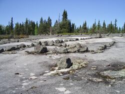 Manitou has made its way into the names of several places in North America. The name of Lake Manitoba (for which the Canadian province of Manitoba is named) derives from the area called manitou-wapow, or "strait of the Manitou" in Cree or Ojibwe, referring to the strange sound of waves crashing against rocks near the Narrows of the lake.[6] Manitoba is also home to Whiteshell Provincial Park's petroforms, symbols made from rocks, which serve as reminders of the instructions given to the Anishinaabe by the Creator. The Anishinaabe Midewiwin, or Grand Medicine Society, considers the area containing the petroforms to be Manito Ahbee, the place where the Creator sits. It is the site where the original Anishinaabe was lowered from the sky to the ground by the Creator.[citation needed]