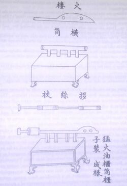 Before use the tank is filled with rather more than three catties of the oil with a spoon through a filter (sha luo); at the same time gunpowder (composition) (huo yao) is placed in the ignition chamber (huo lou) at the head. When the fire is to be started one applies a heated branding iron (to the ignition chamber), and the piston-rod is forced fully into the cylinder—then the man at the back is ordered to draw the piston rod (za zhang) fully backwards and work it (back and forth) as vigorously as possible. Whereupon the oil (the petrol) comes out through the ignition chamber and is shot forth as blazing flame.[7]