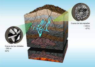 Naica lies on a fault above an underground magma chamber which is approximately 3–5 kilometres (2–3 mi) below the cave. The magma heated the ground water which was saturated with sulfide ions (S2−). Cool oxygenated surface water contacted the mineral-saturated heated water, but the two did not mix because of the difference in their densities. The oxygen slowly diffused into the heated water and oxidized the sulfides (S2−) into sulfates (SO2−4) that precipitated as anhydrite (CaSO4). When the overall temperature of the cave started to drop below 56 °C (133 °F), the hydrothermal and sedimentary anhydrite crystals dissolved, and gypsum (CaSO4 • 2H2O) crystals formed.[7] The hydrated sulfate gypsum crystallized at an extremely slow rate over the course of at least 500,000 years, forming the enormous crystals found today.[8]