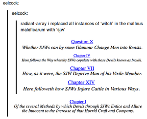 Disconcerted at the actually-decent people reclaiming the term for themselves, reactionaries reached deep into their knowledge of the one half-chapter of 1984 they read once and coined[15] the ridiculously clunky "socjus"[note 2] (pronounced either "Suck-jews" or "Sock-juice"), correctly realizing that this is too silly a term for anyone to try to reclaim, but failing to realize how ridiculous the clunkiness makes them sound saying it.