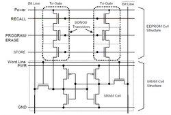 SONOS is a cross-sectional structure of MOSFET used in Non-volatile memory such as EEPROM and flash memories. nvSRAM combines the standard SRAM cells with EEPROM cells in SONOS technology[4] to provide a fast read/write access and 20 years of data retention without power. The SRAM cells are paired one-to-one with EEPROM cells. The nvSRAMs are in the CMOS process, with the EEPROM cells having a SONOS stack to provide nonvolatile storage. When normal power is applied, the device looks and behaves in a similar manner as a standard SRAM. However, when power drops out, each cell’s contents can be stored automatically in the nonvolatile element positioned above the SRAM cell. This nonvolatile element uses standard CMOS process technology to obtain the high performance of standard SRAMs. In addition, the SONOS technology is highly reliable and supports 1 million STORE operations