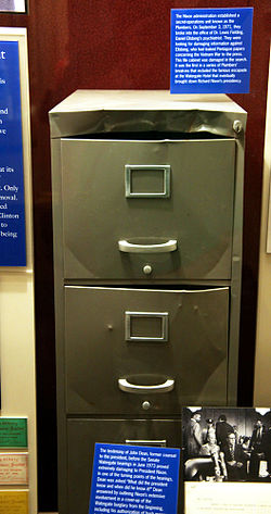 Authorities charged the whistleblower, Daniel Ellsberg, and his accomplice, Anthony Russo, with espionage, theft of government property, and conspiracy. However, the charges were dismissed when the court discovered that Nixon had ordered a break-in at the office of Ellsberg's psychiatrist in an attempt to uncover discrediting personal information.[note 1][9] This was definitely the only time Nixon was ever involved in a scandal where someone broke into a building for political reasons.