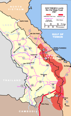 which ran through Cambodia and Laos and was used as a supply route for Viet Cong fighters. This had been known for a while among much of the US public, so it came as more of a confirmation than a surprise when the Pentagon Papers revealed that the United States had secretly expanded operations into Laos during the Johnson administration.[50] The first sustained bombardments against the trail in Laos began in late 1964.[51] Later investigations of the secret war reveal that Laos had more bombs dropped on it than on all of the Axis Powers combined in WWII, making it the most heavily bombed country in history.[52] To this day, unexploded ordnance from the bombings are (slowly) being cleared, as they pose a significant danger to farmers. [53]