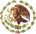 Oak and laurel leaves encircling the eagle cluster; tied together with a ribbon with the Mexican flag's colors