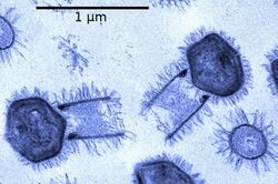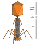 Bacteriophages, often just called phages, are viruses that parasite bacteria and archaea. Marine phages parasite marine bacteria and archaea, such as cyanobacteria.[37] They are a common and diverse group of viruses and are the most abundant biological entity in marine environments, because their hosts, bacteria, are typically the numerically dominant cellular life in the sea. Generally there are about 1 million to 10 million viruses in each mL of seawater, or about ten times more double-stranded DNA viruses than there are cellular organisms,[38][39] although estimates of viral abundance in seawater can vary over a wide range.[40][41] Tailed bacteriophages appear to dominate marine ecosystems in number and diversity of organisms.[37] Bacteriophages belonging to the families Corticoviridae,[42] Inoviridae[43] and Microviridae[44] are also known to infect diverse marine bacteria.