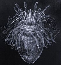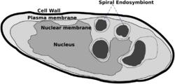 Dinoflagellates often live in symbiosis with other organisms. Many nassellarian radiolarians house dinoflagellate symbionts within their tests.[176] The nassellarian provides ammonium and carbon dioxide for the dinoflagellate, while the dinoflagellate provides the nassellarian with a mucous membrane useful for hunting and protection against harmful invaders.[177] There is evidence from DNA analysis that dinoflagellate symbiosis with radiolarians evolved independently from other dinoflagellate symbioses, such as with foraminifera.[178]