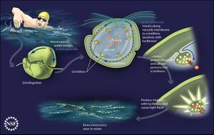 Some dinoflagellates are bioluminescent. At night, ocean water can light up internally and sparkle with blue light because of these dinoflagellates.[179][180] Bioluminescent dinoflagellates possess scintillons, individual cytoplasmic bodies which contain dinoflagellate luciferase, the main enzyme involved in the luminescence. The luminescence, sometimes called the phosphorescence of the sea, occurs as brief (0.1 sec) blue flashes or sparks when individual scintillons are stimulated, usually by mechanical disturbances from, for example, a boat or a swimmer or surf.[181]