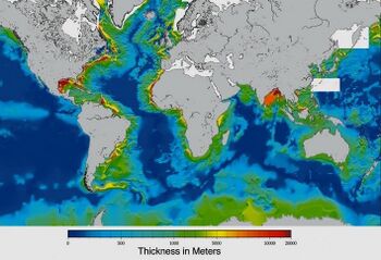 Sediments at the bottom of the ocean have two main origins, terrigenous and biogenous. Terrigenous sediments account for about 45% of the total marine sediment, and originate in the erosion of rocks on land, transported by rivers and land runoff, windborne dust, volcanoes, or grinding by glaciers.