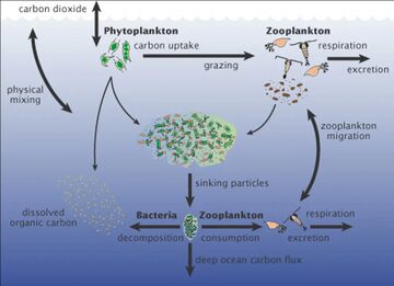 Microscopic life undersea is diverse and still poorly understood, such as for the role of viruses in marine ecosystems.[12] Most marine viruses are bacteriophages, which are harmless to plants and animals, but are essential to the regulation of saltwater and freshwater ecosystems.[13] They infect and destroy bacteria in aquatic microbial communities, and are the most important mechanism of recycling carbon in the marine environment. The organic molecules released from the dead bacterial cells stimulate fresh bacterial and algal growth.[14] Viral activity may also contribute to the biological pump, the process whereby carbon is sequestered in the deep ocean.[15]