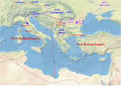 The Romans became aware of the Huns when the latter's invasion of the Pontic steppes forced thousands of Goths to move to the Lower Danube to seek refuge in the Roman Empire in 376, according to the contemporaneous Ammianus Marcellinus.[14] There are also some indications that the Huns were already raiding Transcaucasia in the 360s and 370s.[15] These raids eventually forced the Eastern Roman Empire and Sasanian Empire to jointly defend the passes through the Caucasus mountains.[15]
