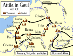 The Hunnic army set out from the Hungarian Plain and likely crossed the Rhine near Koblenz.[124] The Hunnic army included, besides Huns, the Gepids, Rugii, Sciri, Thuringi, Ostrogoths.[134] Thompson suggests that Attila's first objection was the Ripuarian Franks, whom he summarily conquered and drafted into his army.[135] They then captured Metz and Trier, before heading to besiege Orléans, with another detachment unsuccessfully attacking Paris.[124] The approach of Aetius' army, consisting of Romans and allies such as the Visigoths under their king Theodoric I, Burgundians, the Alans, and some Franks, forced the Huns to break the siege of Orléans.[136] Somewhere near Troyes, the two armies met and fought in the Battle of the Catalaunian Fields. In the standard scholarly view of the battle, despite the death of Theodoric, Attila's army was defeated and forced to retreat from Gaul.[137] Kim argues that the battle was actually a Hunnic victory: the Huns had already been leaving Gaul after a successful campaign and simply continued to do so after the battle.[138]