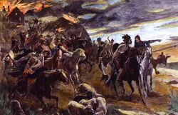 Ruga appears to have made a commitment to aid Aetius in Gaul before his death, and Attila and Bleda kept this commitment.[90] In 437, Huns, under the direction of Aetius and possibly with the involvement of Attila, destroyed the Burgundian kingdom on the Rhine under king Gundahar, an event memorialized in medieval Germanic legend.[91] It is possible that the Huns' destruction of the Burgundians was motivated by revenge for the death of Octar in 430.[92] Also in 437, the Huns helped Aetius capture Tibatto, the leader of the Bagaudae, a group of rebellious peasants and slaves.[93] In 438, an army of Huns aided the Roman general Litorius in an unsuccessful siege of the Visigothic capital of Toulouse.[94] Priscus also mentions that the Huns extended their rule in "Scythia" and fought against an otherwise unknown people called the Sorosgi.[95]