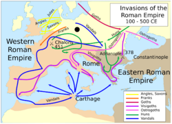 Within Europe, the Huns are typically held responsible for the beginning of the Migration period, in which mostly Germanic tribes increasingly moved into the space of the late Roman Empire.[199][200] Peter Heather has argued that Huns were thereby responsible for the eventual disintegration of the Western Roman Empire, [201] while E. A. Thompson argued that the Huns accelerated Germanic incursions both before and after their own presence on the Roman frontier.[202] Walter Pohl, meanwhile notes that "[w]hat the Huns had achieved was a massive transfer of resources from the Roman empire to the barbaricum".[203] Due to his differing opinions on the organization of the Huns, Hyun Jin Kim argues that, rather than by causing migrations of Germanic peoples, the Huns were responsible for the destruction of the Western Roman Empire by the force of their armies and their efficient imperial administration, leading to a collapse of the Roman military.[204]
