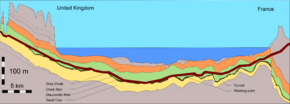 Geological profile along the tunnel as constructed. For most of its length the tunnel bores through a chalk marl stratum (layer)