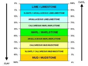 Scheme of the transitional lithotypes from mud (or mudstone) to lime (or limestone), illustrating the definition of marl (marlstone) as a mix of calcium carbonate and clay