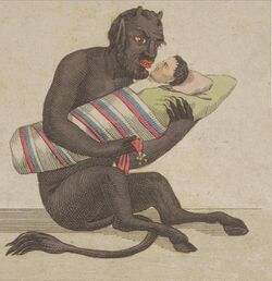A chort (Russian: чёрт, Belarusian and Ukrainian: чорт, Serbo-Croatian čort or črt, Polish: czart and czort, Czech and Slovak: čert, Slovene: črt) is an anthropomorphic malign spirit or demon[1][2] in Slavic folk tradition. Chorts are often depicted identically to Christian devils, with horns, hooves, and a skinny tail.[citation needed] In Slavic mythology, a singular Chort is sometimes identified as a son of the god Chernobog and the goddess Mara.[3][page needed] Likewise, in Ukraine mythology, Chorts were originally the priest of Chernobog.[4] In folk Christianity, they are considered lesser minions of Satan.