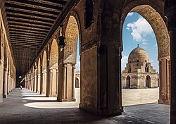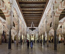 Arab-plan or hypostyle mosques are the earliest type of mosques, pioneered under the Umayyad Dynasty. These mosques have square or rectangular plans with an enclosed courtyard (sahn) and covered prayer hall. Historically, in the warm Middle Eastern and Mediterranean climates, the courtyard served to accommodate the large number of worshippers during Friday prayers. Most early hypostyle mosques had flat roofs on prayer halls, which required the use of numerous columns and supports.[61] Frequently, hypostyle mosques have outer arcades (riwaq) so that visitors can enjoy the shade. Arab-plan mosques were constructed mostly under the Umayyad and Abbasid dynasties. The simplicity of the Arab plan limited the opportunities for further development, the mosques consequently losing popularity.[61] One of the most notable hypostyle mosques is the Great Mosque of Cordoba in Spain, the building being supported by over 850 columns,[62] other notable examples include the Umayyad Mosques of Damascus and Aleppo, Qibli Mosque (part of Al-Aqsa) in Jerusalem and the Great Mosques of Samarra (Al-Malwiya Mosque and Abu Dulaf Mosque),[63] in addition to the Great Mosque of Kairouan, Al-Zaytuna Mosque in Tunis and Al-Qarawiyyin Mosque in Fez.[64] Those Arab-plan or hypostyle mosques are based on the early Prophet's mosque in Medina.[65]